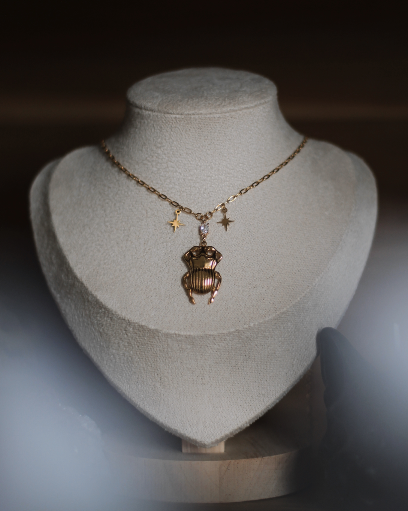 On raconte que le scarabée roulait le soleil à travers le ciel. Khepri, collier symbole de renaissance et de lumière éternelle.